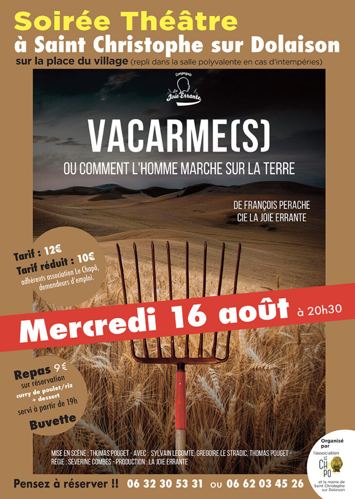 16 Août @ 20h30 – 23h30 – THEÂTRE : La Chaponie (association Le Chapô) s’exporte, le mercredi 16 août, sur la place du village de St Christophe sur Dolaison, avec VACARME(S) de la Compagnie La Joie Errante. Tarif : 12€ Tarif réduit (adhérent association Le Chapô et demandeurs d’emploi) : 10€ Possibilité de se restaurer sur place (à partir de 19h) : […]